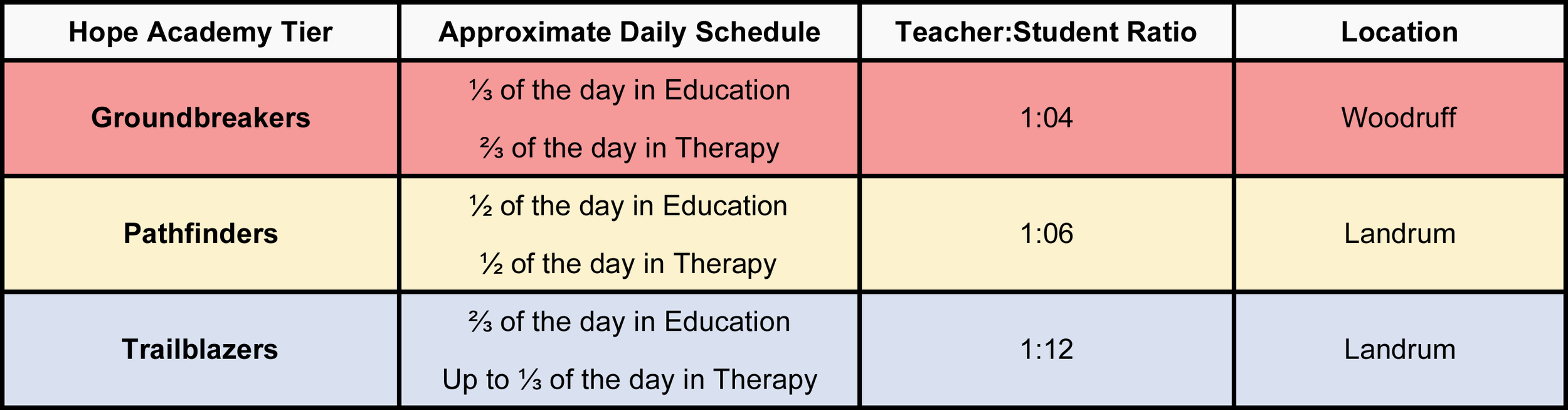 Hope Academy operates year-round, from September through August, with breaks each quarter. School hours are 8:30 AM to 4:30 PM, Monday through Friday. Classes are held at our Landrum and Woodruff campuses, with limited bus transportation to both campuses available from centralized drop-off locations.